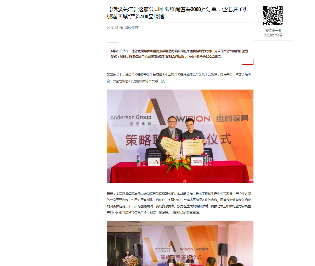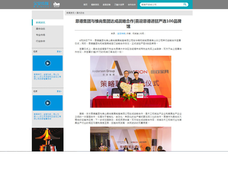 恩德集團與佛山維尚傢俱製造有限公司在華南機械城恩德佛山分公司舉行戰略合作簽署儀式;