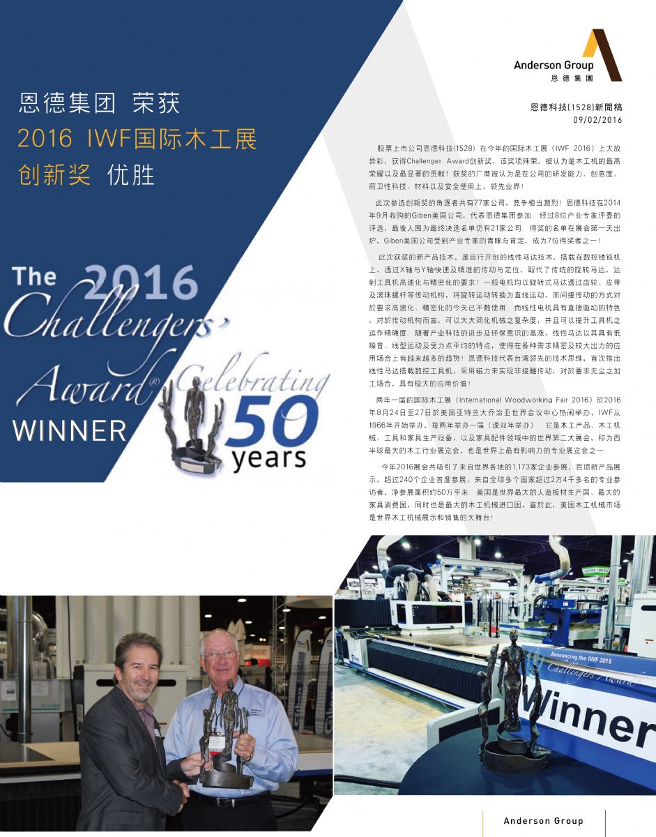 恩德集团 荣获 2016 IWF国际木工展 创新奖优胜